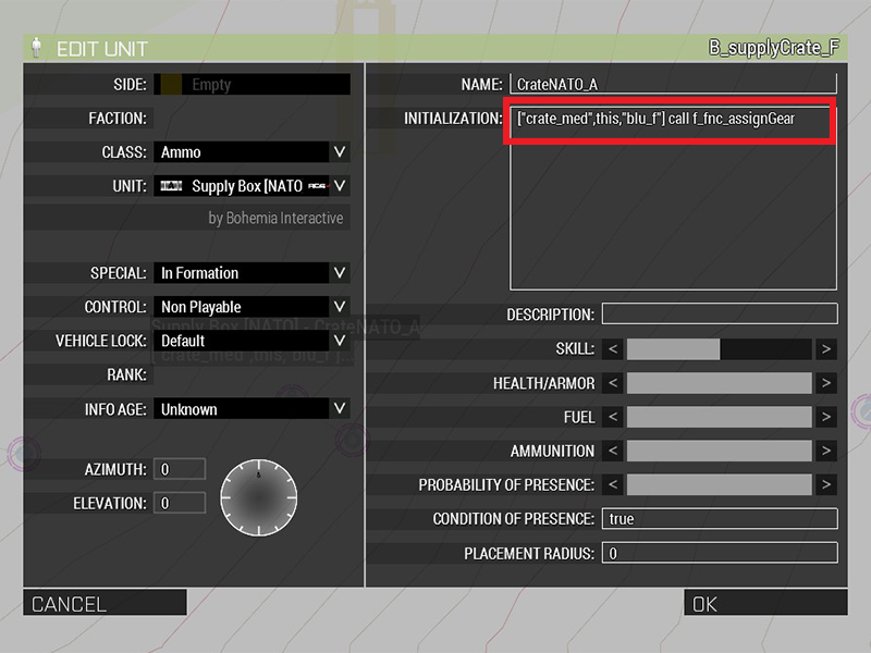 The first parameter (“crate_med”) passes the desired gear configuration to the script, the second (this) references the crate object for the script and the third (“blu_f”) tells the gear script which factions gear should be added to the box. In this case, the crate receives a “crate_med” loadout from the “blu_f” (NATO) faction.