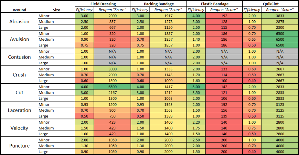 In the ACE Medical mod code, each bandage has efficiency and reopen statistics for each size (small, medium, large) and type (cut, velocity, avulsion, etc) of wound. However, for discussion here, the bandages will be considered as a whole, keeping all wound types/sizes in mind, rather than focusing on specific bandage/wound type/wound size combinations.