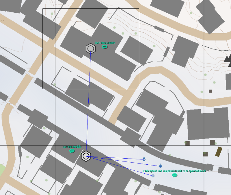 Each unit synced to the garrison module will become a possible unit to be spawned inside the area. If you want to increase the chance of a certain unit to spawn, sync several versions of it. Note the module will also apply TMF loadouts or arsenal loadouts that are applied to the synced units.